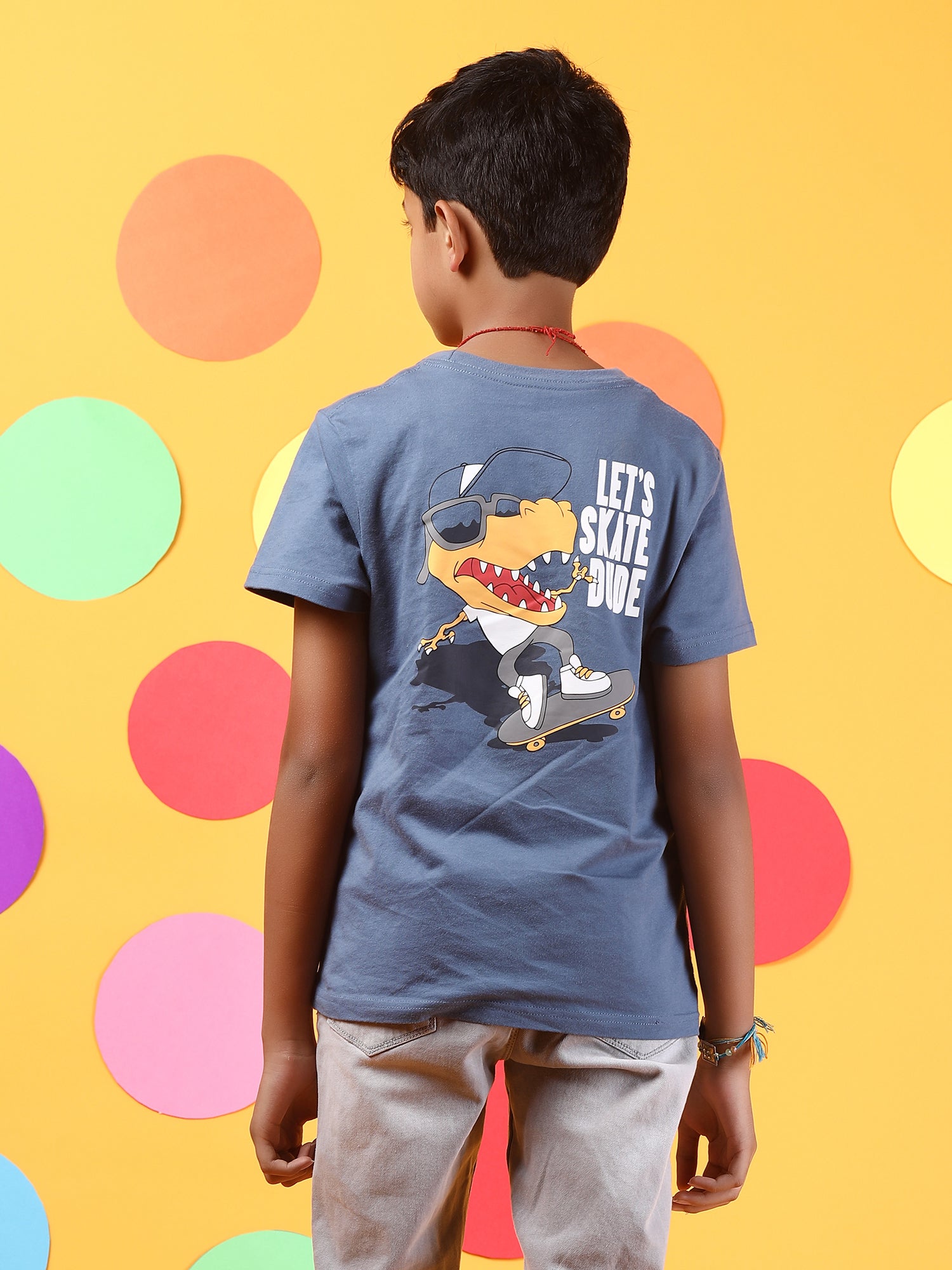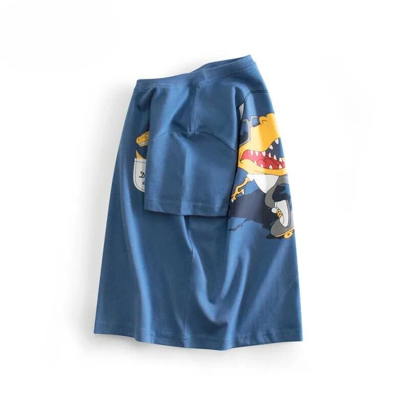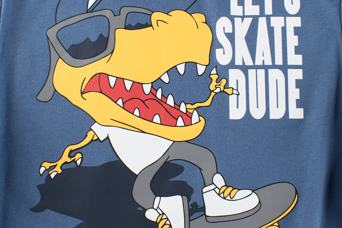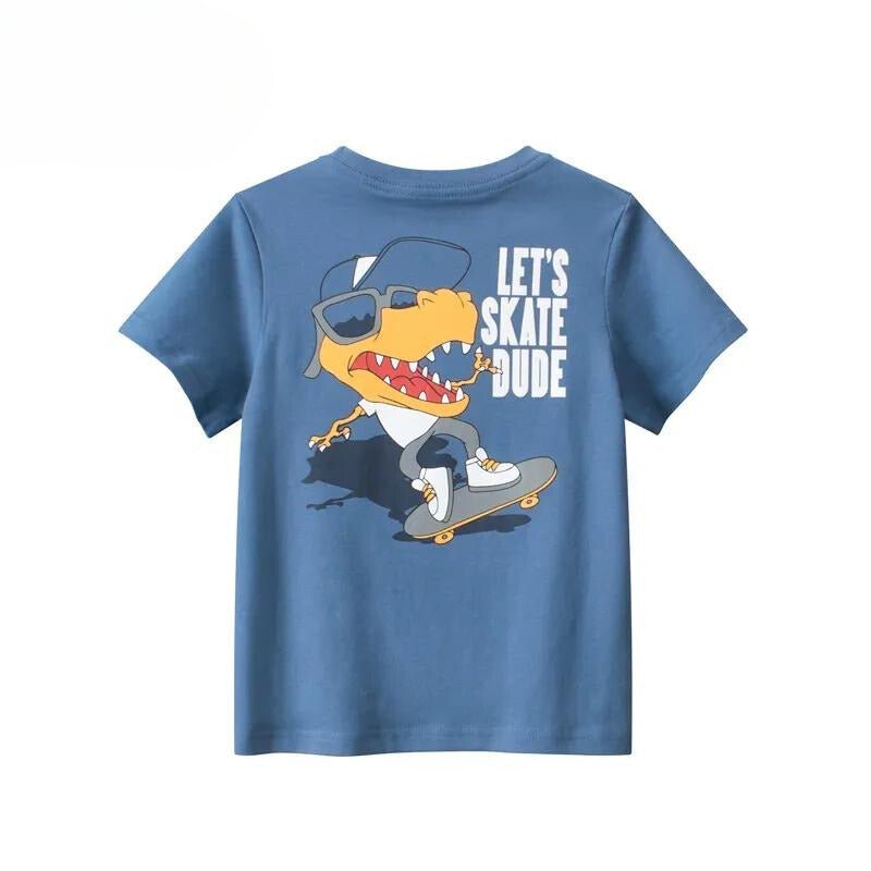 Imagination takes center stage with our t-shirt's Dino Cartoon with Skates pattern. This playful design sparks creativity and brings a smile to your child's face. Whether your little one is skateboarding at the park or exploring the backyard, this t-shirt's whimsical charm keeps them company every step of the way.