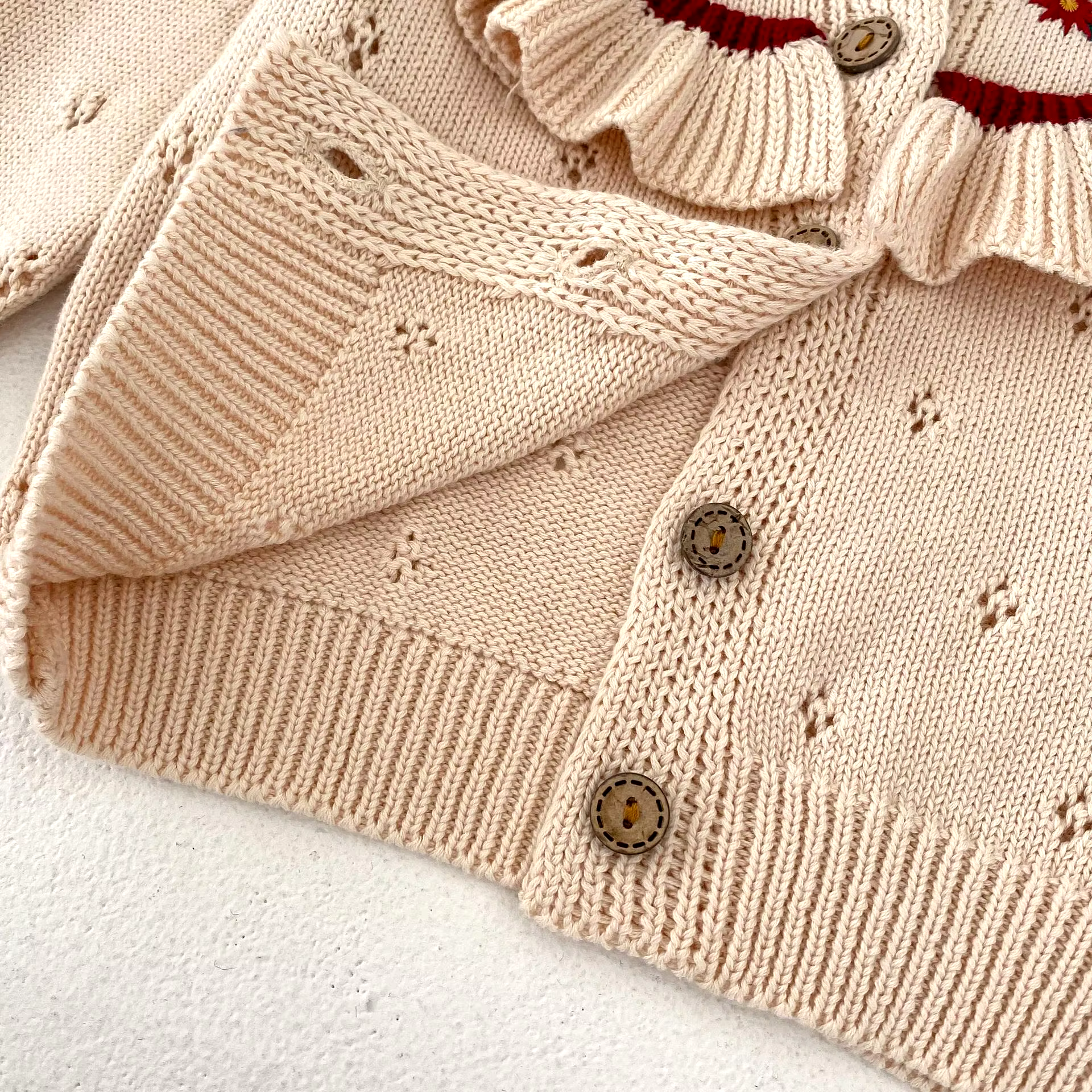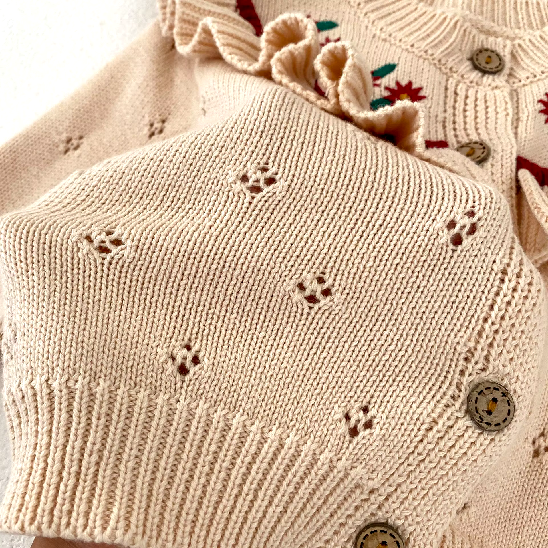 Make your baby’s wardrobe stand out with this hollowed-out embroidered cardigan featuring charming ruffled detailing on the shoulders. The intricate embroidery brings a delicate, vintage-inspired touch, while the ruffles add a playful and cute accent. It’s perfect for special occasions or simply for everyday wear when you want your baby to look extra adorable. The design is subtle yet eye-catching, making it a go-to option for parents who love elegant and unique babywear.