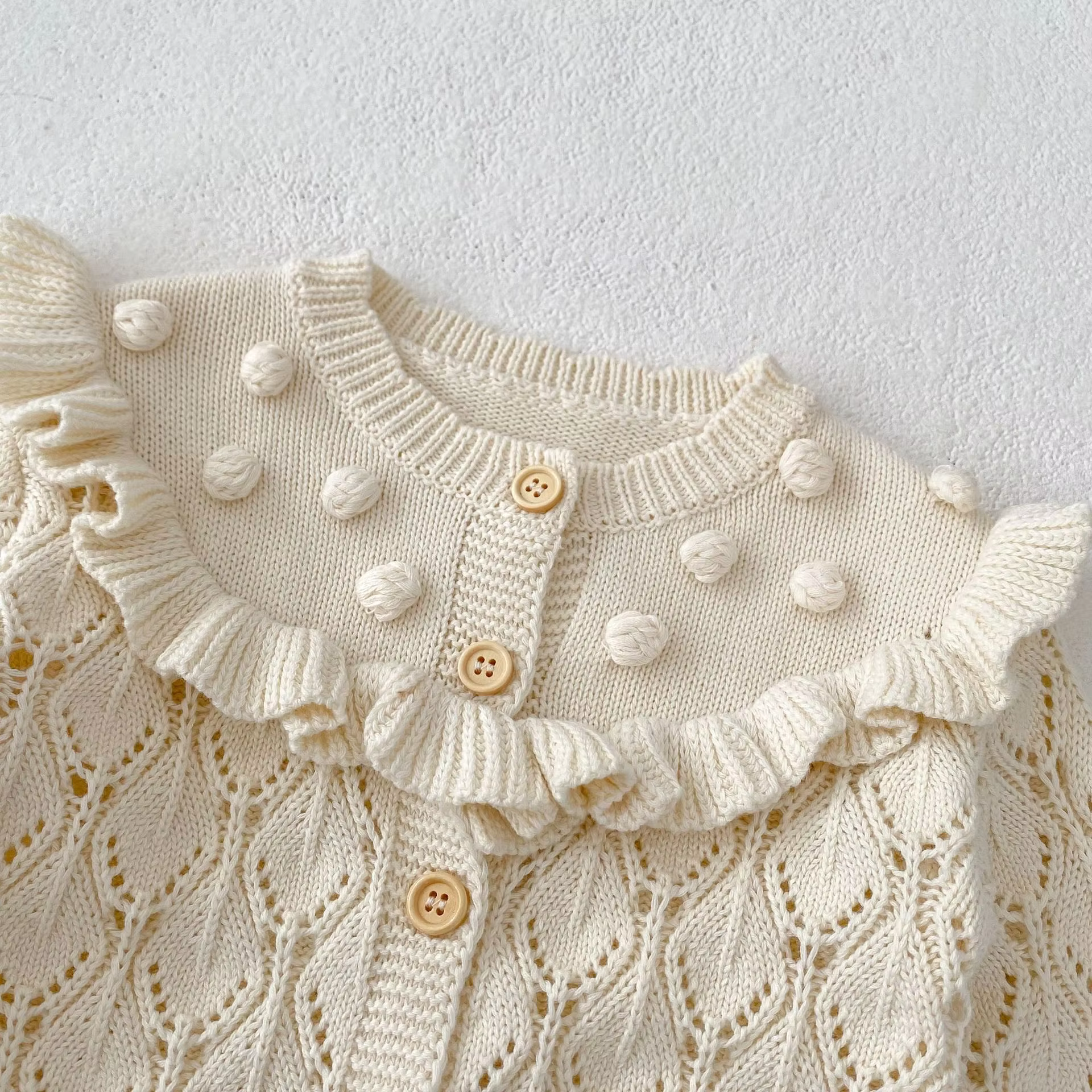 This cardigan blends elegance and functionality effortlessly. Its sleek, minimalist design ensures it pairs beautifully with any outfit, from onesies to dresses. The classic front button opening not only adds charm but also simplifies dressing and undressing your little one. Available in versatile, neutral color, this cardigan is a wardrobe essential that complements every look.