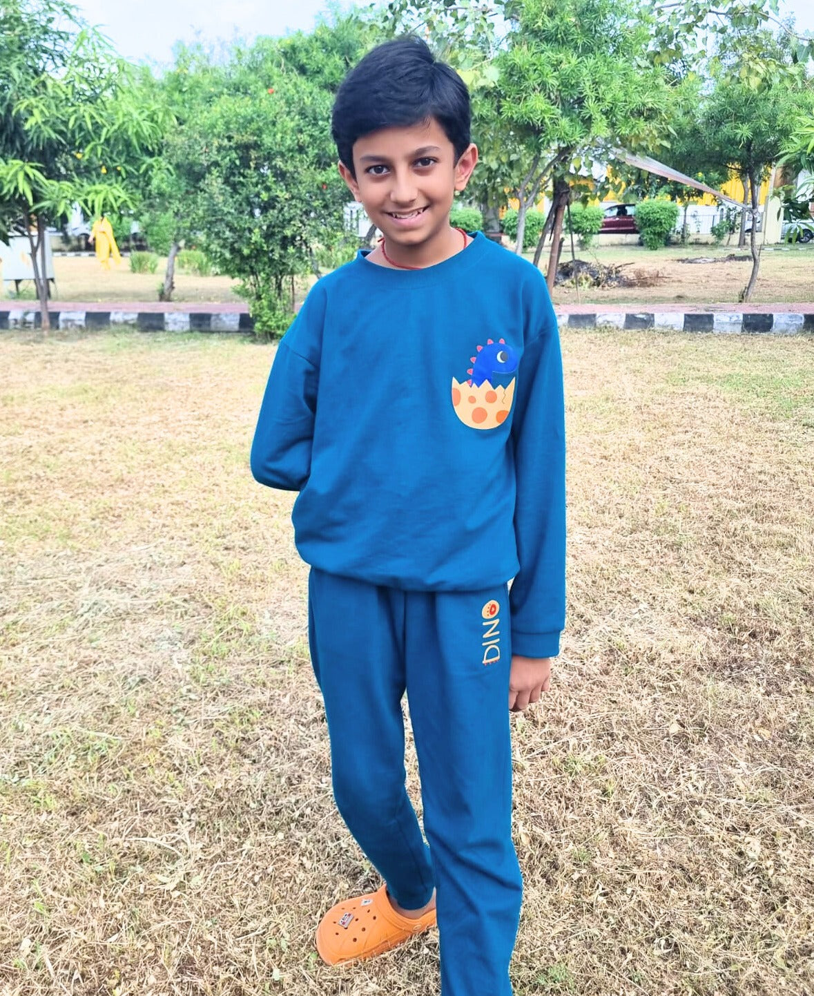 Introducing our Co-Ord Set in Teal Blue, featuring a playful Dino design. Crafted from thick Cotton Terry, this set is an invitation to adventure and style. Let your child roar into action, knowing they're comfortable and ready for exciting escapades.