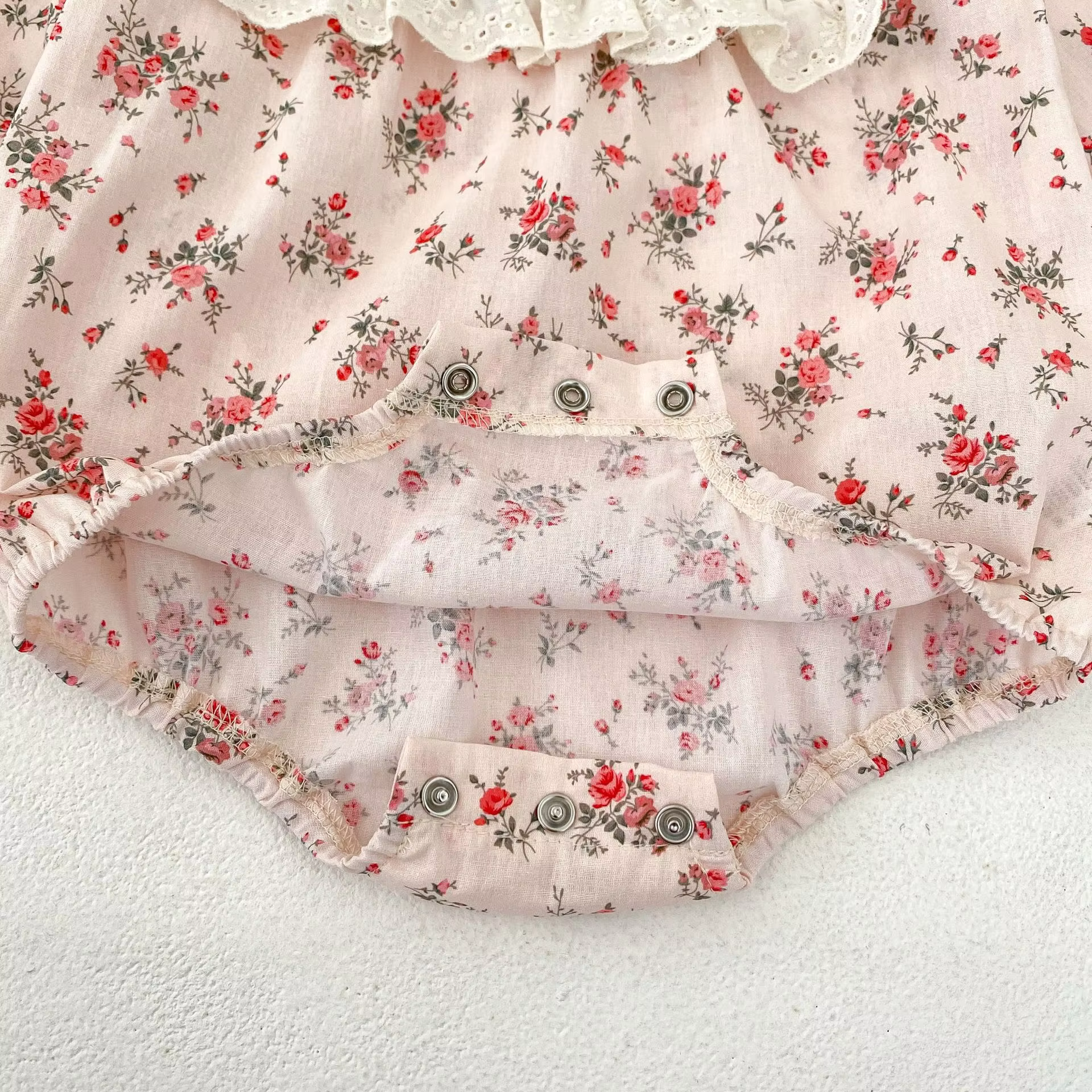 The embroidered yolk and intricate ruffled lace detailing make this romper truly one of a kind. Each stitch is carefully designed to highlight the romper's floral motif, giving it a sophisticated look that stands out. The soft pastel tones and delicate craftsmanship make it an ideal outfit for special occasions, whether it's a birthday, a holiday celebration, or a milestone photoshoot.